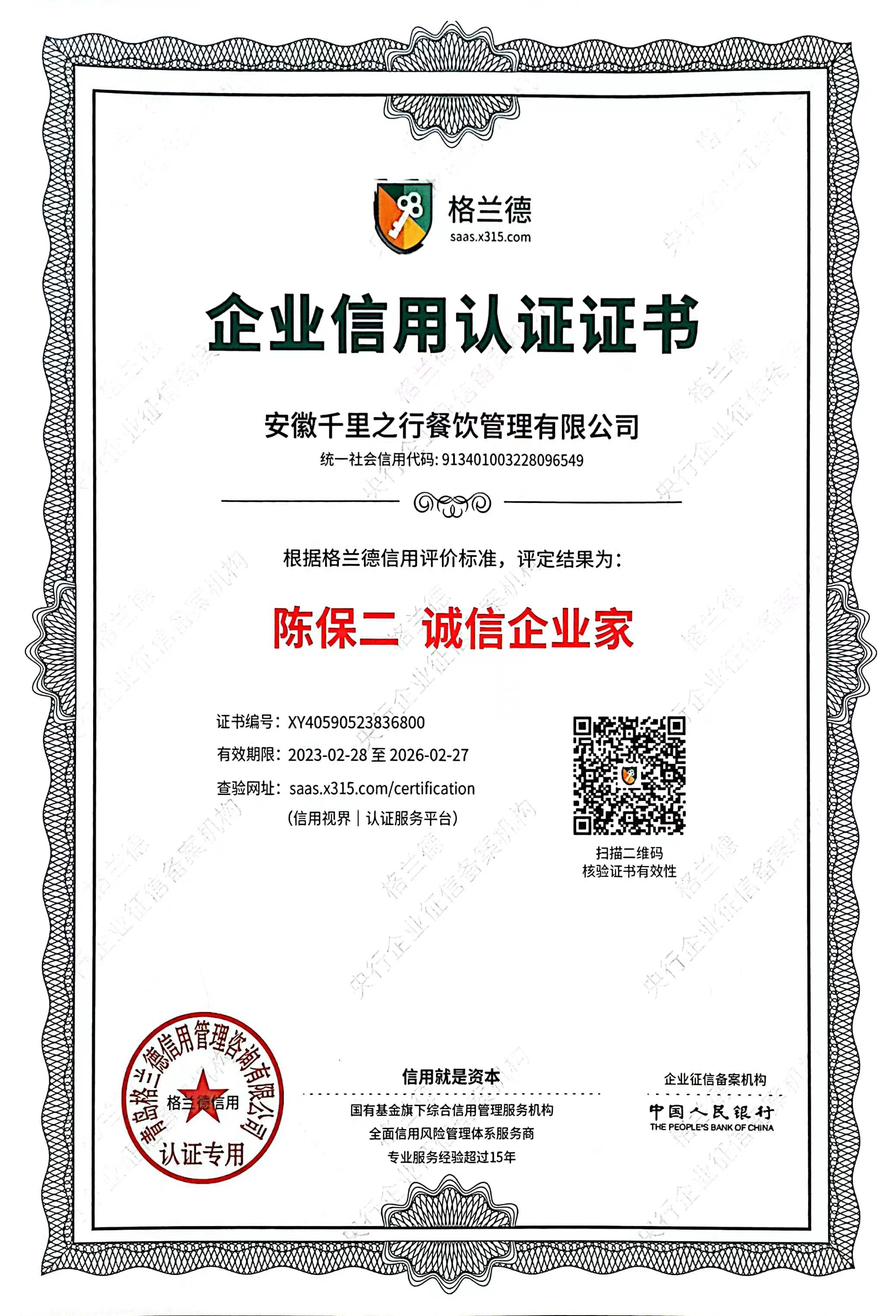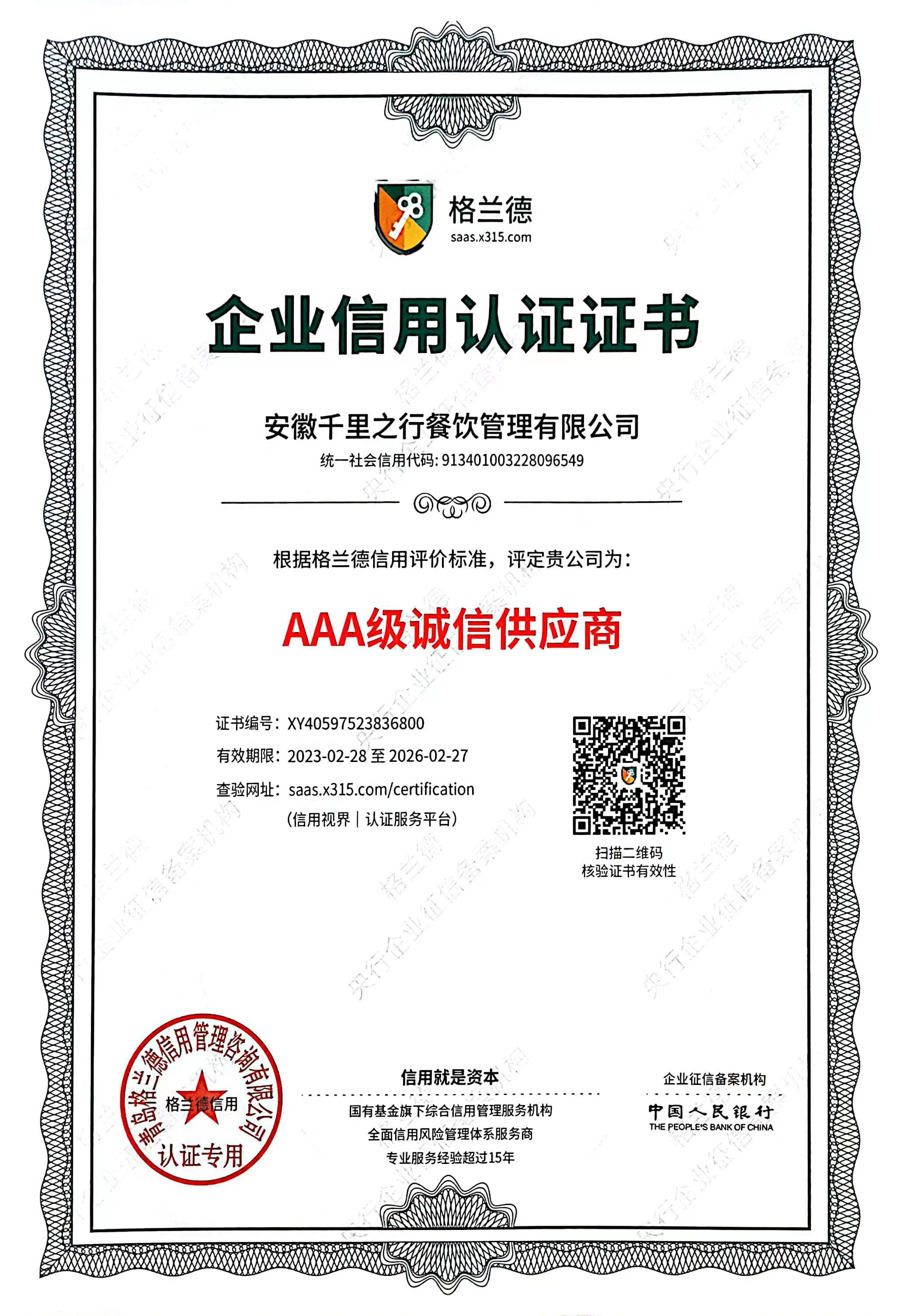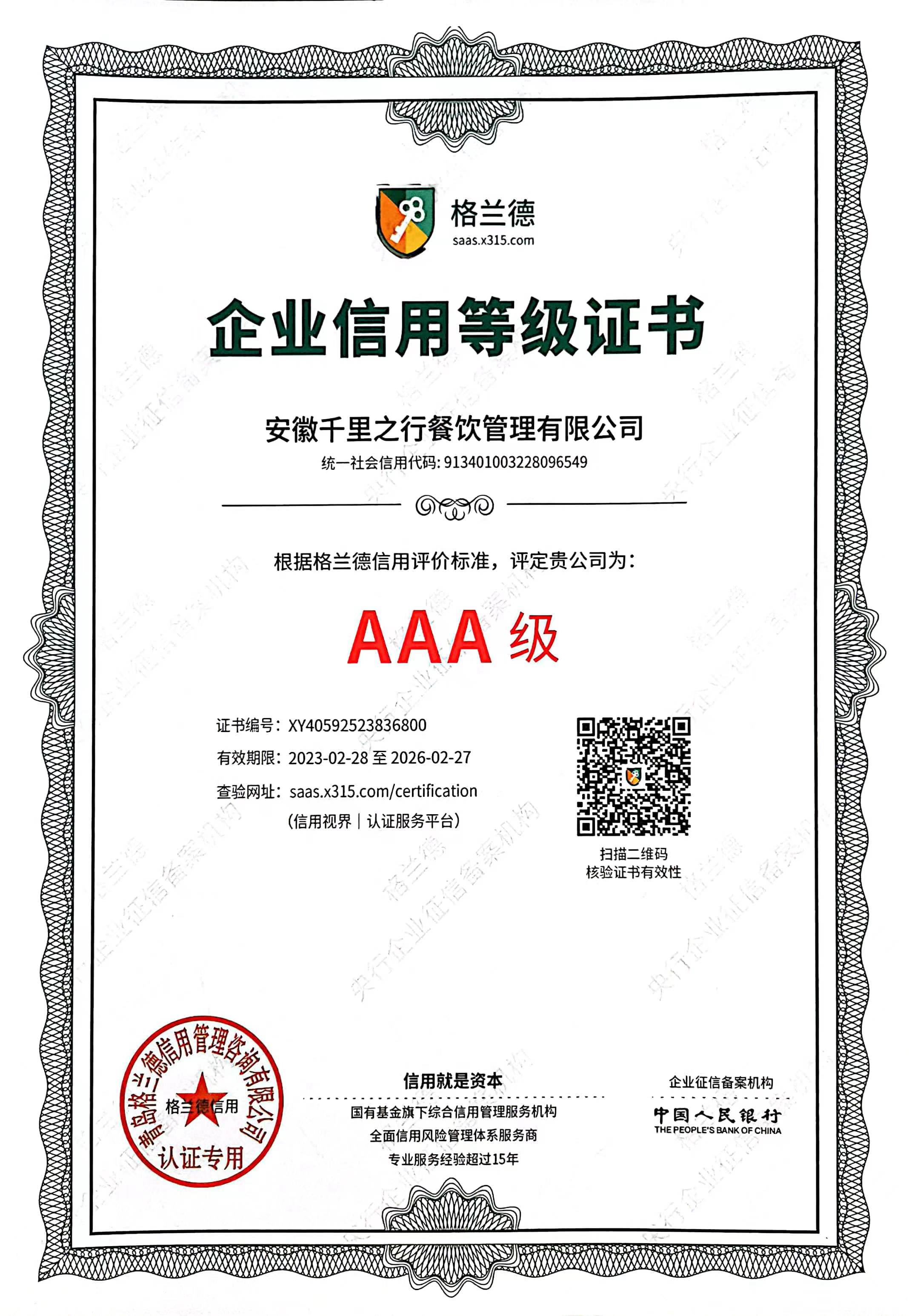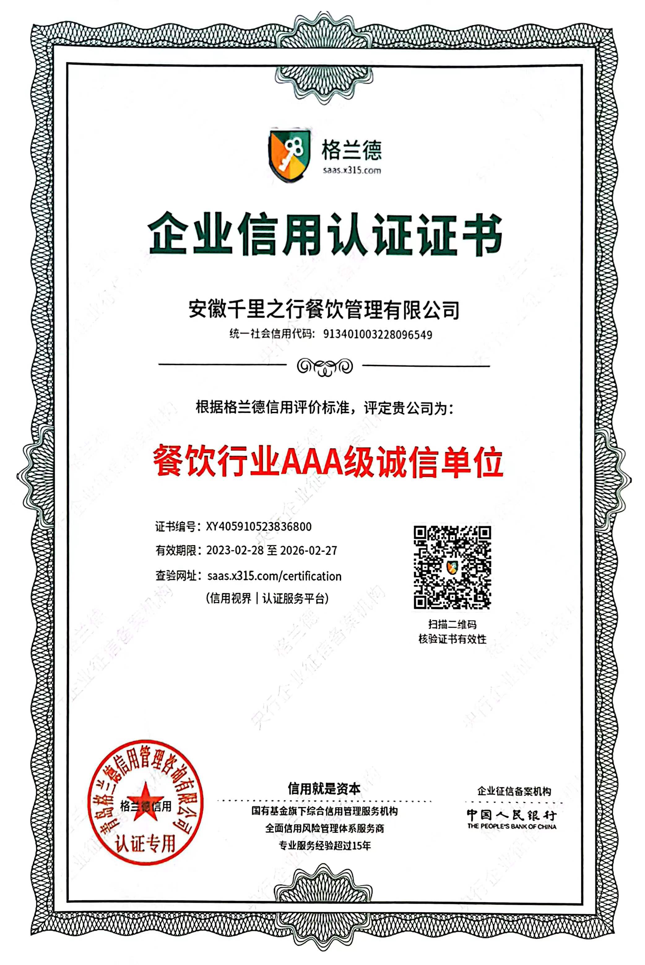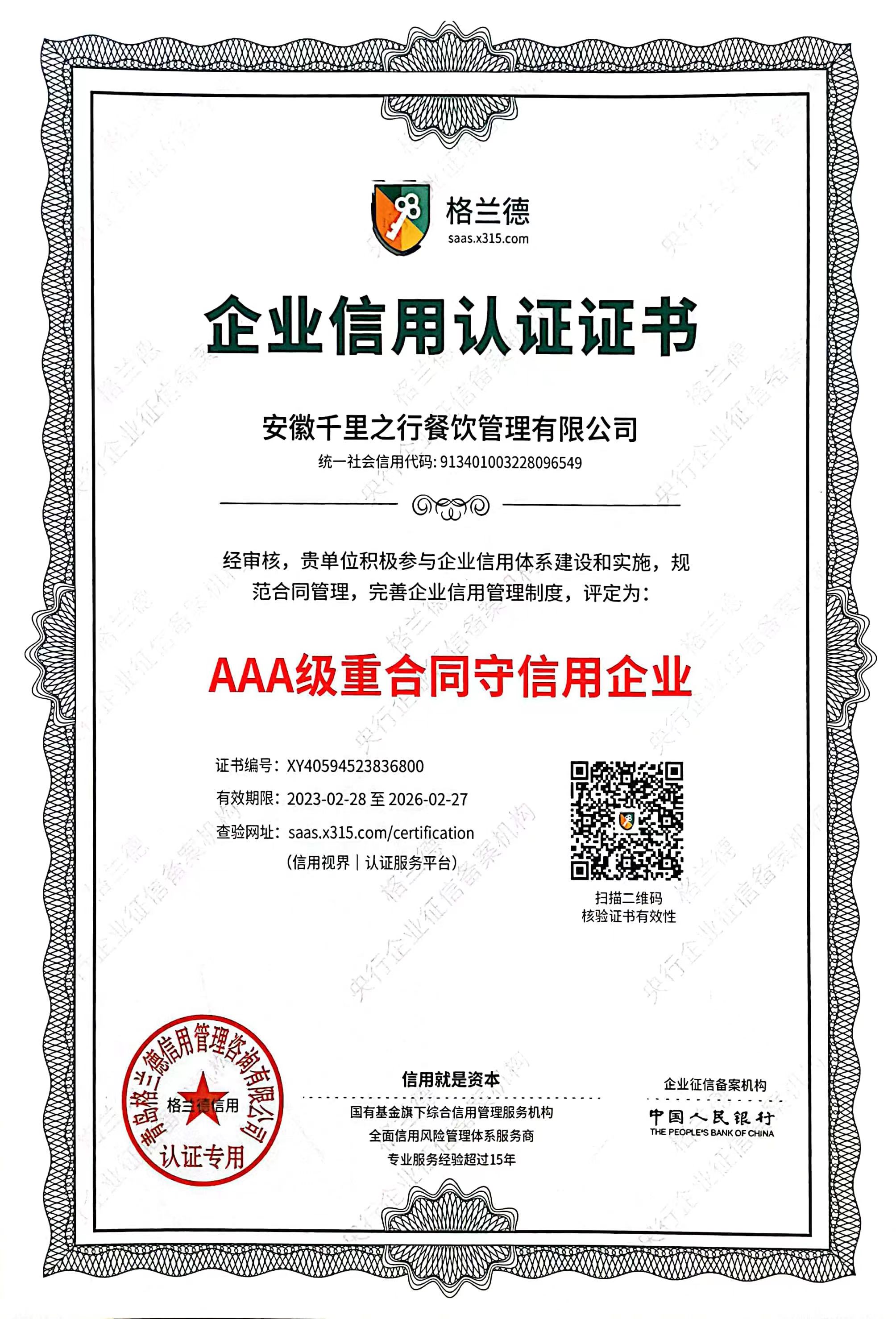 • 餐饮行业AAA级诚信单位