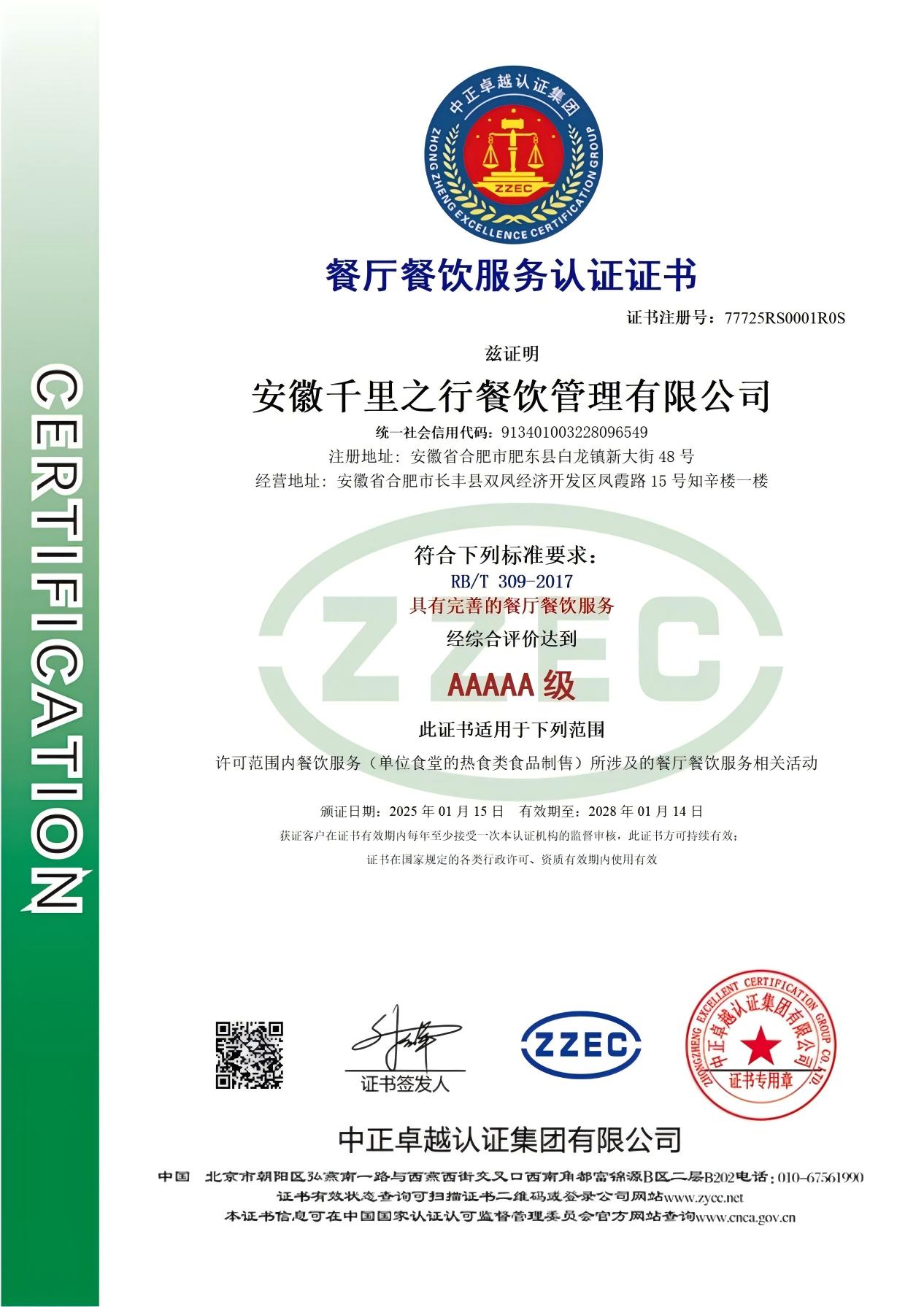 • 餐厅餐饮服务认证证书