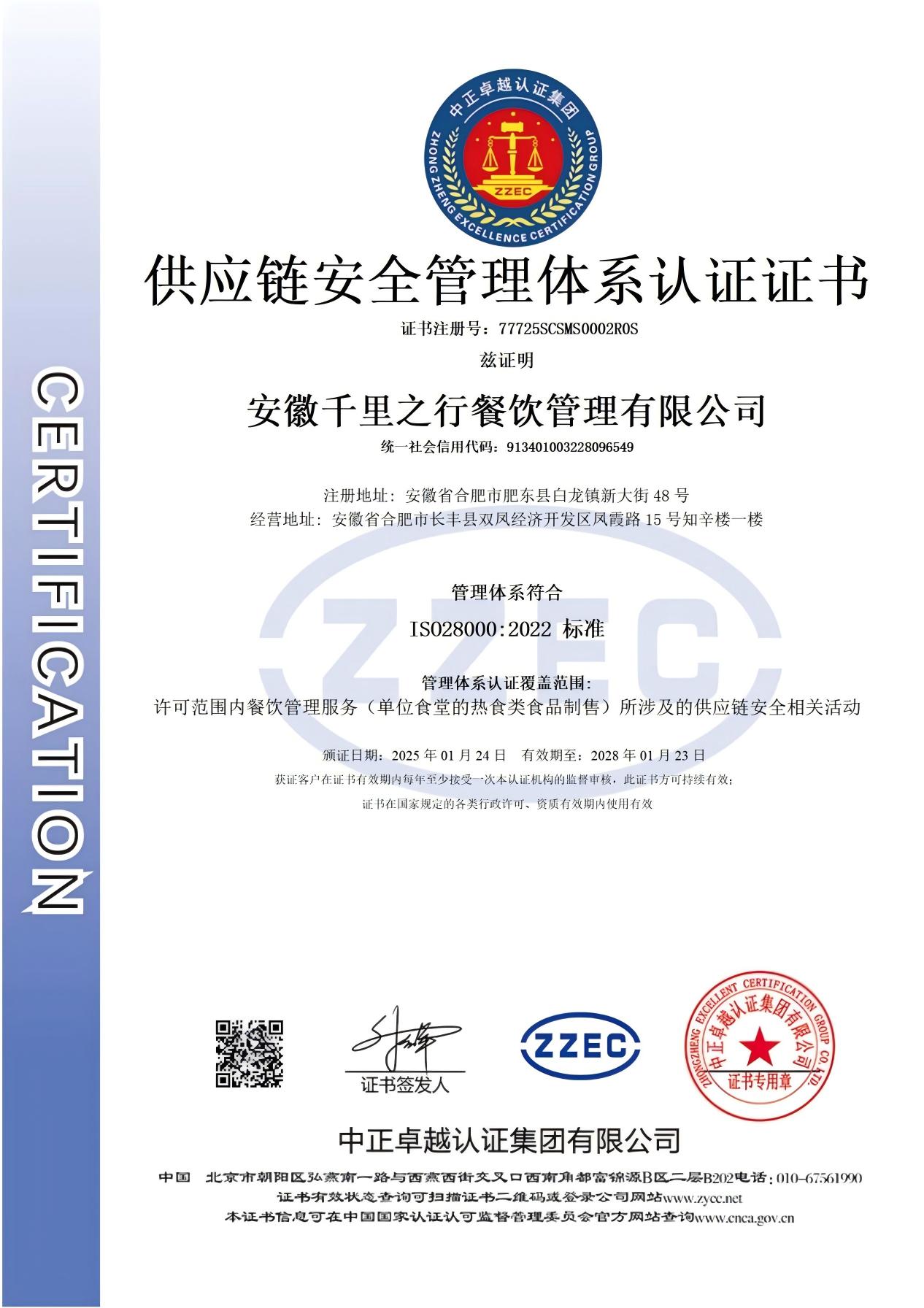 • 供应链安全管理体系认证证书